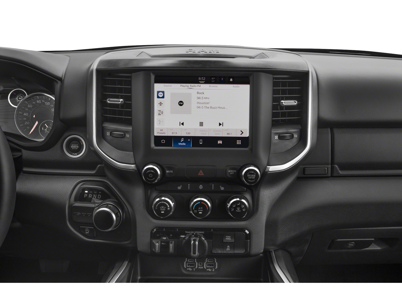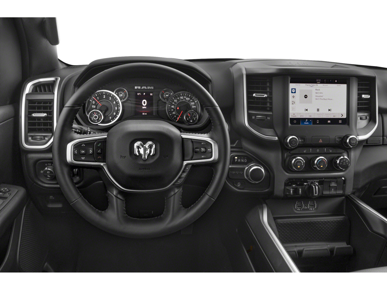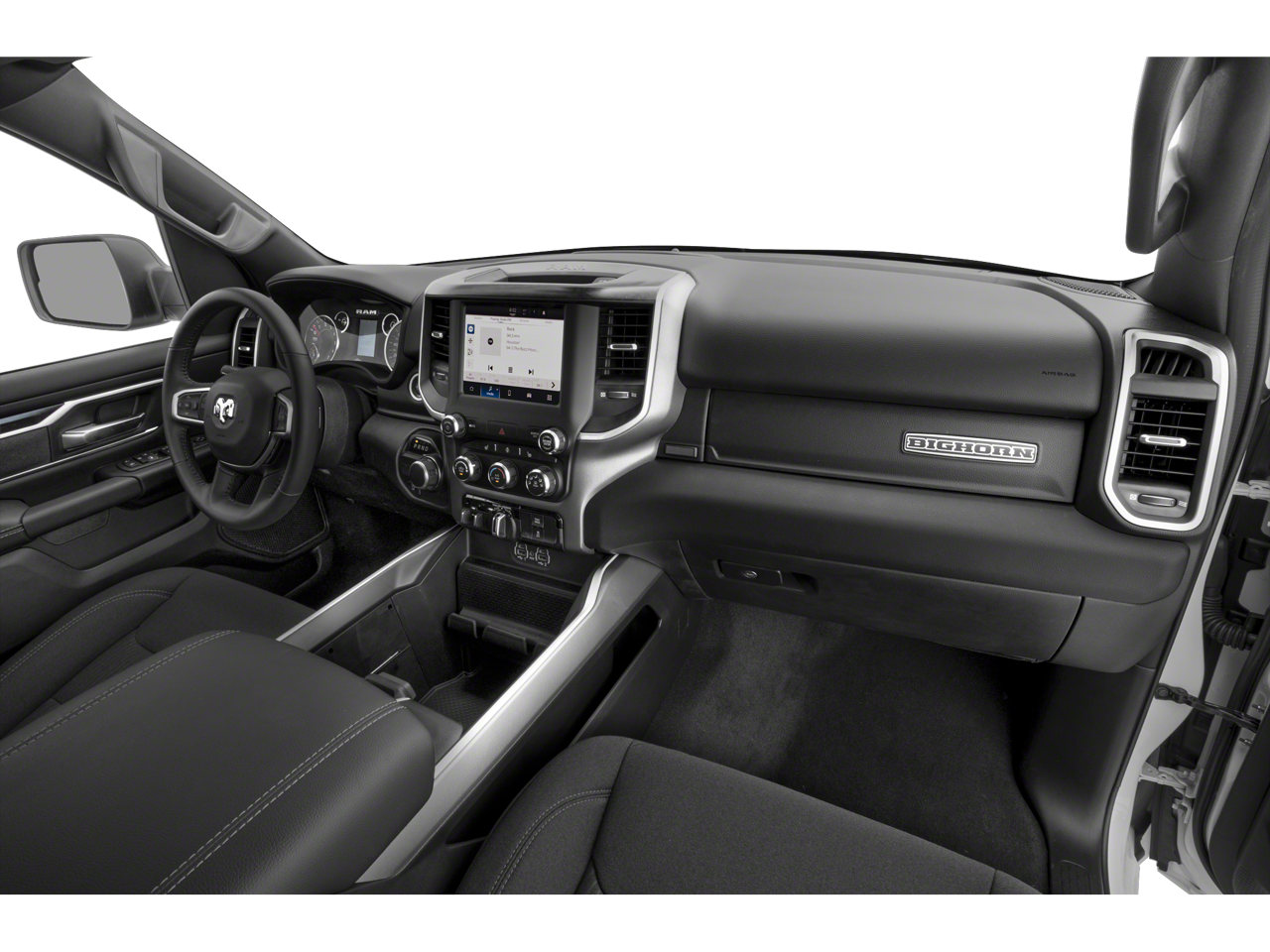 115V Auxiliary Power Outlet, 12 Touchscreen Display, 2nd Row In Floor Storage Bins, 3 Rear Seat Head Restraints, 3.21 Rear Axle Ratio, 4 Way Front Headrests, 4-Wheel Disc Brakes, 400W Inverter, 48V Belt Starter Generator, 4G LTE Wi-Fi Hot Spot, 6 Speakers, 8.4 Touchscreen Display, 9 Amplified Speakers w/Subwoofer, ABS brakes, Air Conditioning, Air Conditioning ATC w/Dual Zone Control, All R1 High Radios, All Radio Equipped Vehicles, Alloy wheels, AM/FM radio, Apple CarPlay, Auto-Dimming Exterior Driver Mirror, Auto-Dimming Rear-View Mirror, Big Horn Badge, Big Horn Level 2 Equipment Group (DISC), Black Exterior Mirrors, Black Premium Power Mirrors, Bluetooth® Handsfree Phone & Audio, Brake assist, Bumpers: chrome, Class IV Receiver Hitch, Cloth Bench Seat, Cluster 7.0 TFT Color Display, Compass, Connected Travel & Traffic Services, Connectivity - US/Canada, Convex Wide-Angle Exterior Mirror Insert, Delay-off headlights, Disassociated Touchscreen Display, Driver door bin, Dual front impact airbags, Dual front side impact airbags, Electric Shift-On-Demand Transfer Case, Electronic Stability Control, Emergency communication system: SiriusXM Guardian, Exterior Mirrors Courtesy Lamps, Exterior Mirrors w/Heating Element, Exterior Mirrors w/Supplemental Signals, For Details, Visit DriveUconnect.com, For More Info, Call 800-643-2112, Front anti-roll bar, Front Center Armrest w/Storage, Front Fog Lamps, Front reading lights, Front Seat Back Map Pockets, Front wheel independent suspension, Fully automatic headlights, Global Telematics Box Module (TBM), Glove Box Lamp, Google Android Auto, GPS Antenna Input, GPS Navigation, HD Radio, Heated door mirrors, Heated Front Seats, Heated Steering Wheel, Illuminated entry, Integrated Center Stack Radio, Integrated Voice Command w/Bluetooth®, Leather steering wheel, LED Footwell Lighting, Low tire pressure warning, Media Hub w/2 Charge Only USBs, Occupant sensing airbag, Outside temperature display, Overhead airbag, Overhead console, Panic alarm, ParkSense Front/Rear Park Assist w/Stop, ParkView Rear Back-Up Camera, Passenger door bin, Passenger vanity mirror, Power 2-Way Driver Lumbar Adjust, Power 8-Way Driver Seat, Power Adjustable Pedals, Power door mirrors, Power steering, Power windows, Power-Folding Mirrors, Protection Group, Quick Order Package 28Z Big Horn (DISC), Radio data system, Radio: Uconnect 3 w/5 Display, Radio: Uconnect 5 Nav w/12.0 Display, Radio: Uconnect 5 W w/8.4 Display, RAM Grille Badge - Chrome, Rear 60/40 Folding Seat, Rear anti-roll bar, Rear Dome w/On/Off Switch Lamp, Rear Power Sliding Window, Rear seat center armrest, Rear step bumper, Rear Window Defroster, Remote keyless entry, Remote Start System, Security Alarm, SiriusXM Satellite Radio, SiriusXM w/360L, Speed control, Split folding rear seat, Steering wheel mounted audio controls, Sun Visors w/Illuminated Vanity Mirrors, Tachometer, Telescoping steering wheel, Tilt steering wheel, Tow Hooks, Traction control, Trailer Brake Control, Trip computer, Universal Garage Door Opener, USB Host Flip, Variably intermittent wipers, Voltmeter, Wheels: 18 x 8 Cast-Aluminum Painted, Wheels: 20 x 9 Aluminum Chrome Clad. Diamond Black Crystal Pearlcoat 2023 Ram 1500 Big Horn/Lone Star 4WD 8-Speed Automatic EcoDiesel 3.0L V6 21/29 City/Highway MPG 21/29 City/Highway MPG