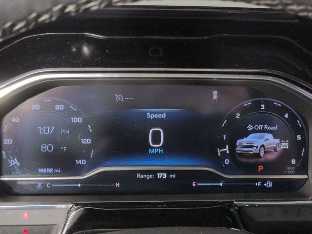 The exterior of this Silverado is adorned in a sleek Black finish, complemented by a host of premium features. The LTZ Premium Package includes a power sunroof, while the Technology Package adds a 15-inch Diagonal Head-Up Display and Rear Camera Mirror. The Z71 Off-Road Package enhances its capability with features like Hill Descent Control, skid plates, and all-terrain tires.